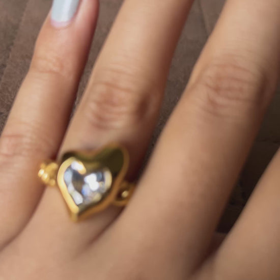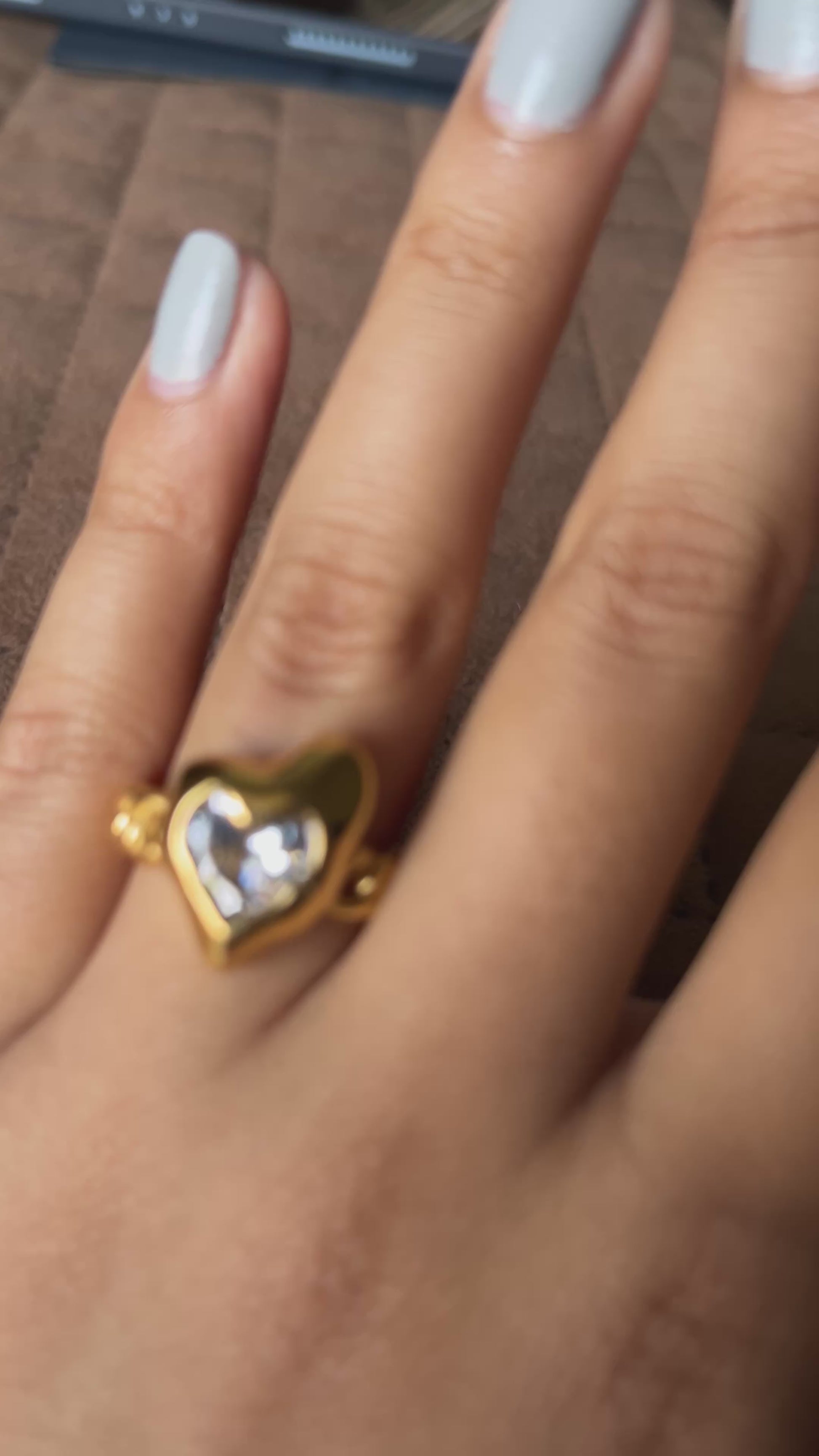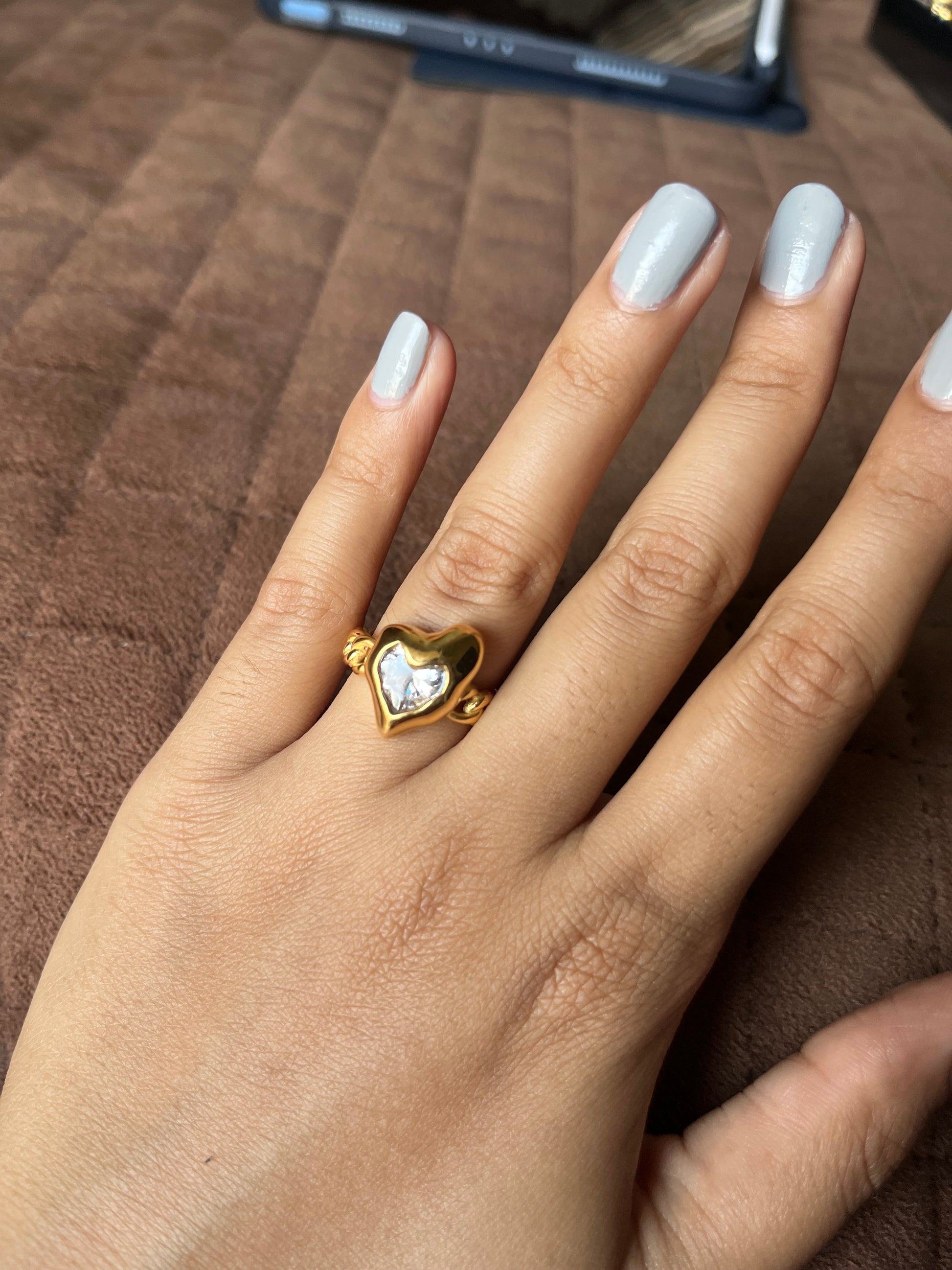 This ring has a romantic yet bold energy — the puffed gold heart shape feels playful and sculptural, with a central gem that adds sparkle. It’s giving luxury meets love-core.